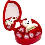 Caixa de Presente de 13cm em Formato de Coração com Ursinho de Pelúcia e Rosas Artificiais