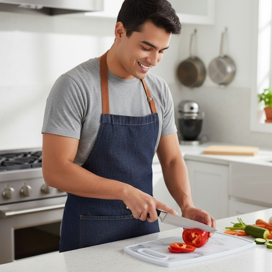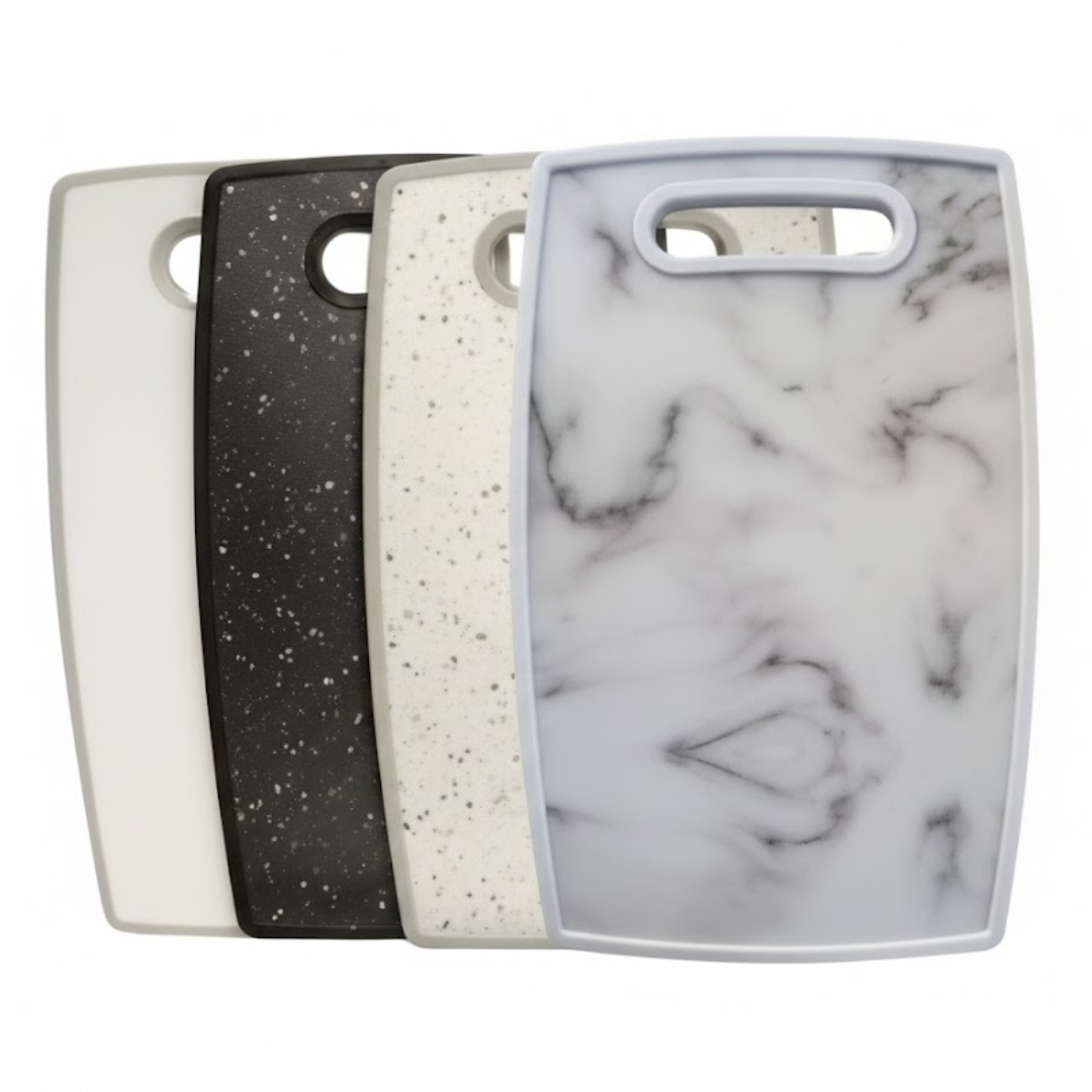 A parte plástica é a ideal para o contato com alimentos, sendo fácil de limpar, higiênica e suave para o fio das facas. A base em MDF é utilizada para apresentar a Estampa Sortida (temas variados de cozinha, frutas, ou padrões decorativos), que confere um charme único à peça.