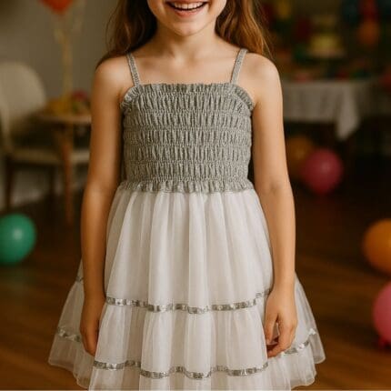A escolha perfeita para transformar sua princesinha em uma verdadeira estrela! Este vestido mágico combina o brilho radiante do prateado com o conforto do poliéster, garantindo que sua pequena brilhe em qualquer ocasião especial.