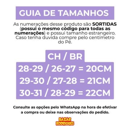 GUIA DE TAMANHOS – Consulte as opções pelo WhatsApp na hora de efetivar a compra ou deixe nas observações do pedido.