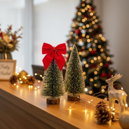 Kit 2 Mini Pinheiros 18cm Nevados de Natal com Laço Vermelho