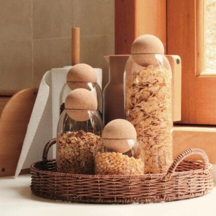 Adote os potes de vidro com tampa de cortiça e transforme sua cozinha em um ambiente mais sustentável, organizado e elegante!